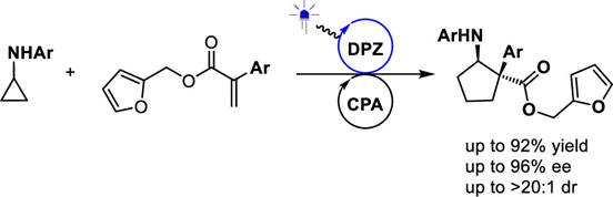 117. Dai, Y., Huang, H., Liang, S., Yin, Y., Ban, X., Zhao, X., Jiang, Z., Catalytic Asymmetric Intermolecular [3 + 2] Photocycloaddition of Cyclopropylamines with Electron-Deficient Olefins. Org. Lett. 2023, 25 (24), 4551-4555. https://doi.org/10.1021/acs.orglett.3c01585